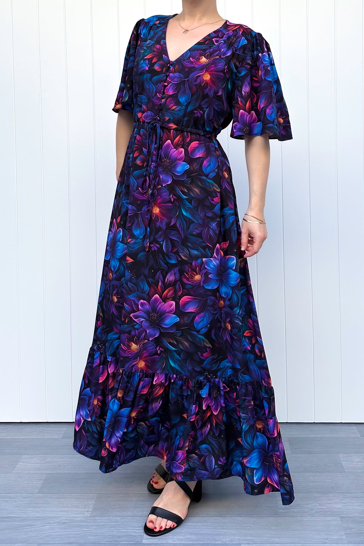 The Obsidian Petal Peony Maxi Dress blooms with inky florals layered in sapphire and violet tones, creating a look that feels rich, romantic and a little mysterious. It’s the kind of dress that makes you feel powerful, designed for moments when you want elegance with an edge. Made from soft touch rayon, it's lightweight, breathable and beautifully breezy. Finished with subtle puffed flutter sleeves and a ruffled tier hem, it creates flow, movement and twirl appeal.